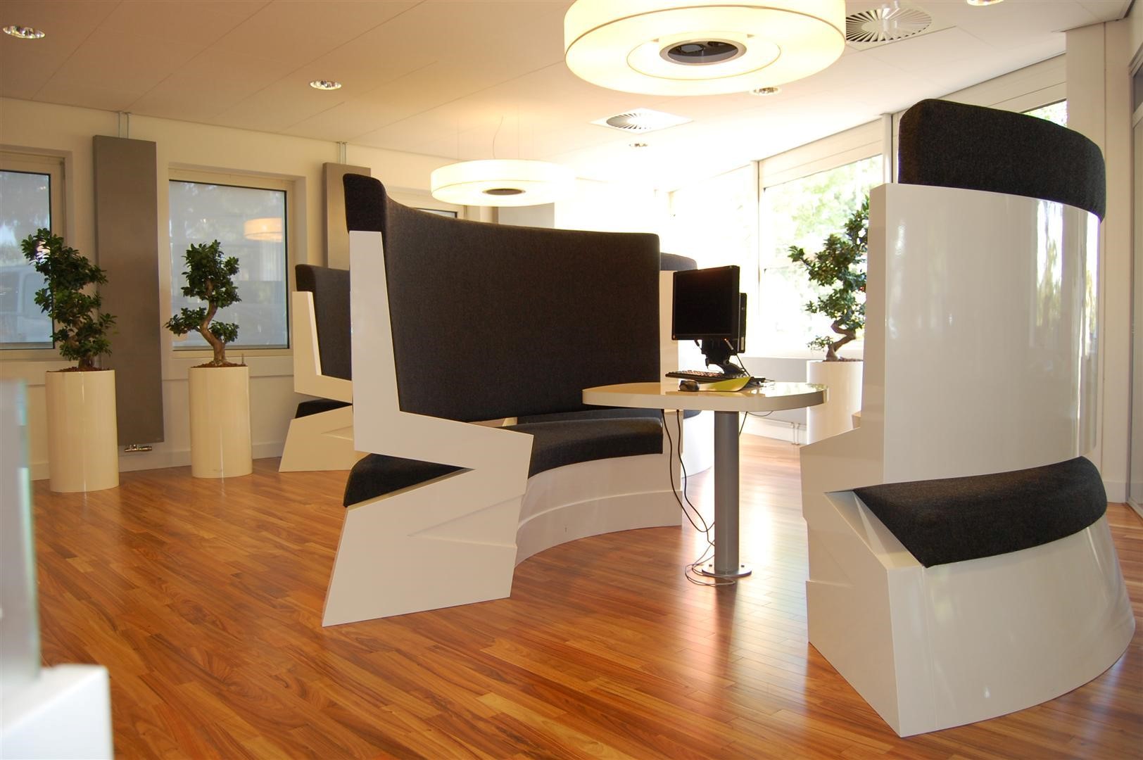 De entree is totaal gerenoveerd en uitgebreid om meer daglichttoetreding te genereren. De entree is ruim en voorzien van een houten vloer. De witte balie en de twee spreekmeubels staan in fraai contrast met de gebogen kernwand die voorzien is van antraciet structuurbehang. Met de nieuwe entree is een moderne en professionele uitstraling gecreëerd.